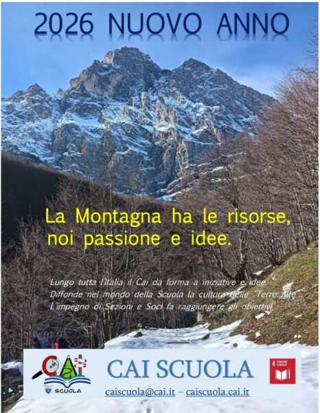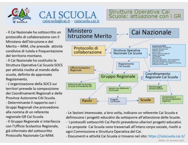 Il 2026 sarà un anno particolarmente importante per la Struttura Operativa Cai Scuola. Nati da poco c’è da comporre la presenza CAI Scuola regione per regione e coordinare le attività (aperte a ogni interessato). Il primo scambio sarà con i Gruppi Regionali per individuare dei referenti regionali e dare continuità al dialogo con le Sezioni. In programma il monitoraggio delle attività svolte con le scuole chiedendo alle Sezioni di compilare un dedicato questionario.