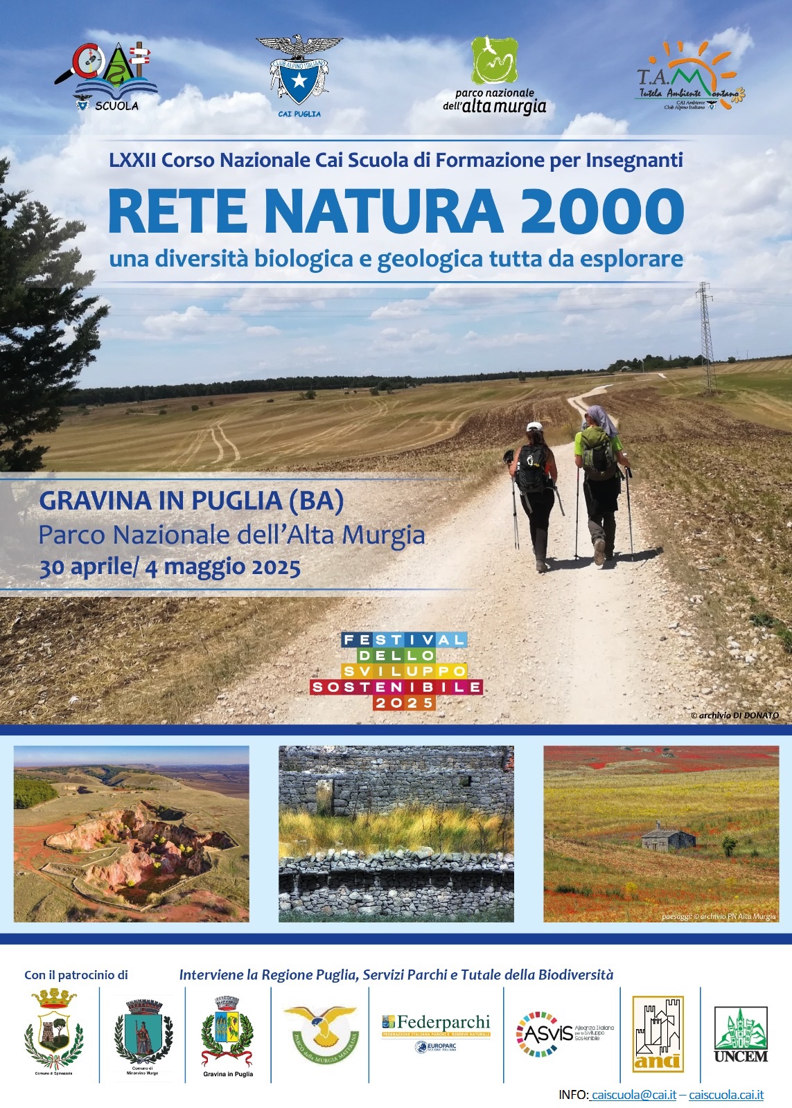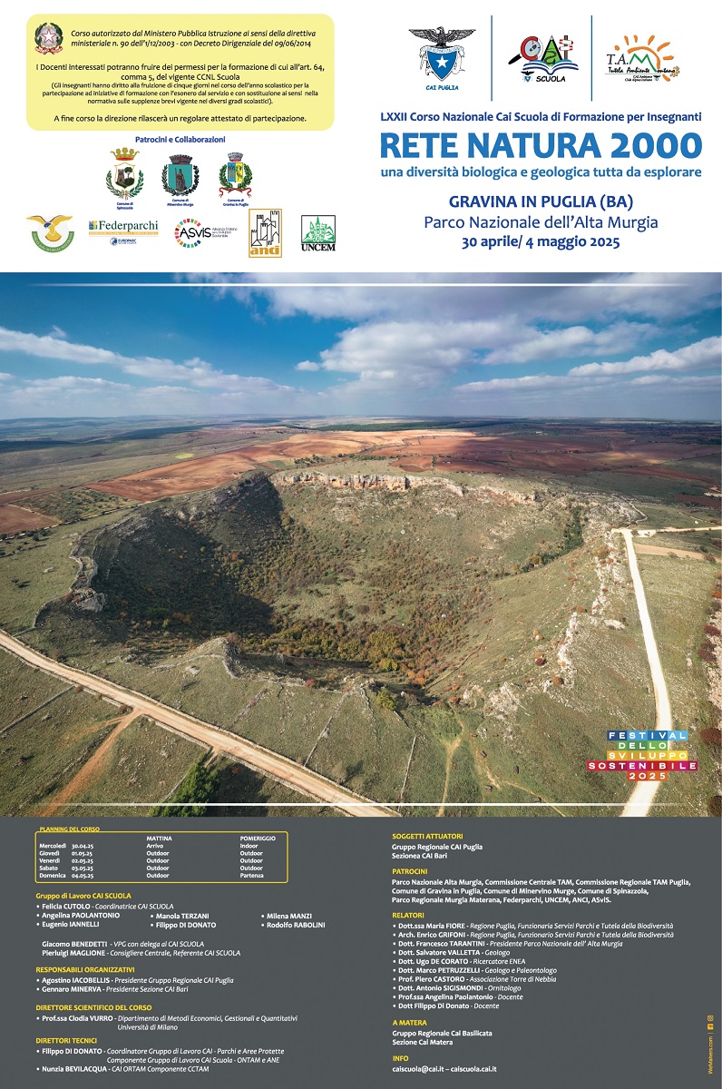 72° Corso Cai Scuola di formazione per docenti a Gravina in Puglia, nel Parco Nazionale dell’Alta Murgia, dal 30 aprile a 4 maggio 2025, “Rete Natura 2000- una diversità biologica e geologica tutta da esplorare”.