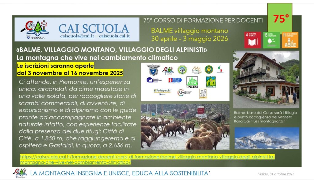 75° Corso Cai Scuola di formazione docenti a Balme, in Piemonte: LE ISCRIZIONI SARANNO APERTE DAL 3 AL 16 NOVEMBRE 2025 AL VIA LE ISCRIZIONI CORSI 2026 CAI SCUOLA DI FORMAZIONE DOCENTI Ci avviciniamo al 2026 e sono prossime le date di novembre per iscriversi al primo Corso nazionale Cai Scuola di formazione docenti, in … Leggi tutto 75° Corso Cai Scuola di formazione docenti a Balme, in Piemonte: LE ISCRIZIONI SARANNO APERTE DAL 3 AL 16 NOVEMBRE 2025