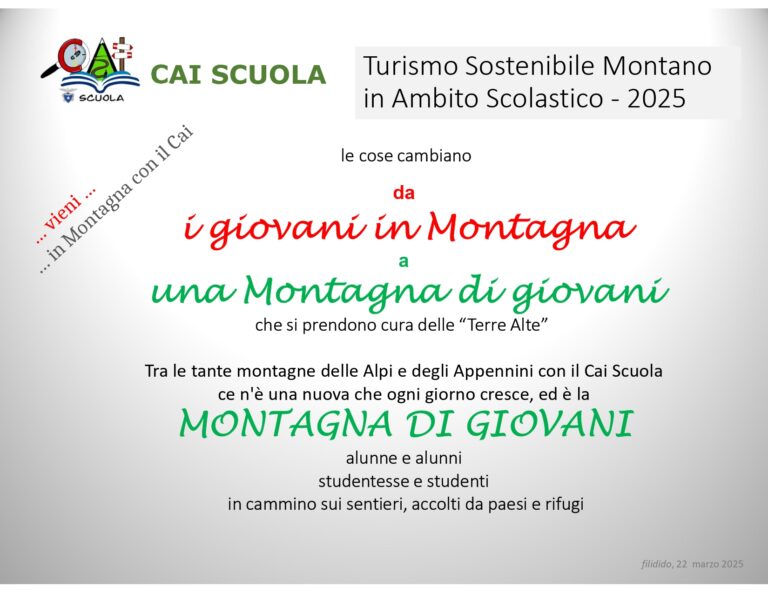 Cai Scuola: progetto Turismo Sostenibile Montano in Ambito Scolastico – TSMAS 2025 da “i giovani in Montagna” a “una Montagna di giovani” Cai Scuola promuove il Progetto TSMAS 2025 Le Sezioni Cai hanno la possibilità di usufruire di un contributo a fondo perduto di euro 2.000,00 per lo svolgimento di progetti di Turismo Sostenibile Montano … Leggi tutto Cai Scuola: progetto Turismo Sostenibile Montano in Ambito Scolastico – TSMAS 2025