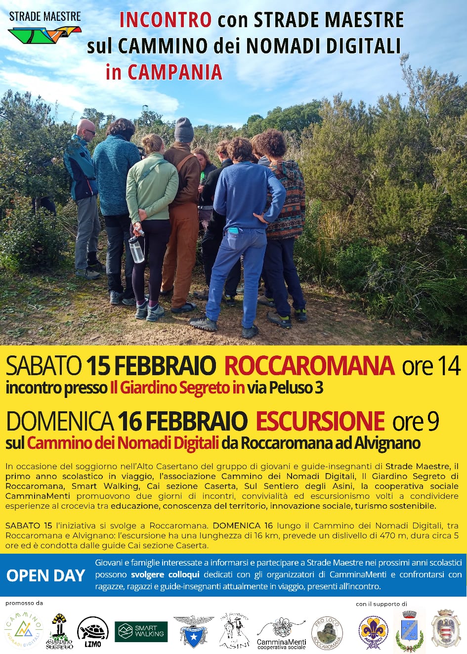 Appuntamento a Roccaromana. Ci ritroveremo al “giardino segreto” che sarà anche luogo di partenza dell’escursione percorrendo il Cammino dei Nomadi Digitali, fino alla struttura “Sul sentiero degli asini”.