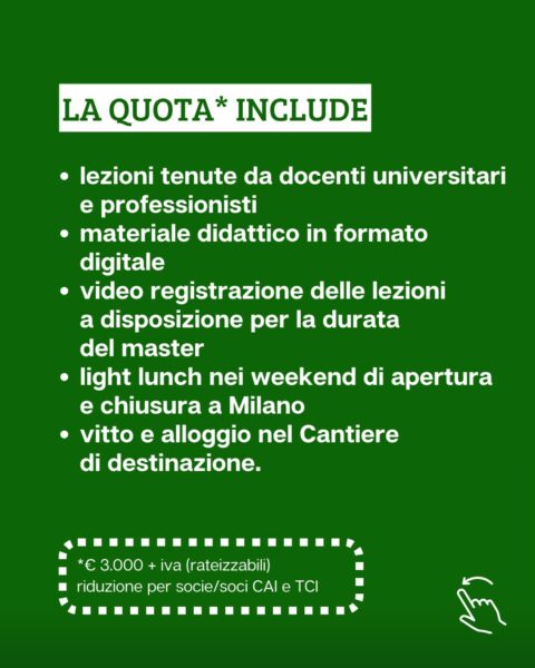Il Master è organizzato da Club Alpino italiano, Touring Club Italiano e Fondazione Campus, su un articolato piano di studi.