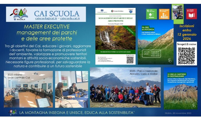 CLUB ALPINO ITALIANO, TOURING CLUB ITALIANO E FONDAZIONE CAMPUS: 3a edizione del “MASTER EXECUTIVE in management dei parchi e delle aree protette“- Cai Scuola Aperte le iscrizioni fino al 12 gennaio, con riduzioni previste per socie e soci CAI e Touring Tra gli obiettivi del Cai, educare i giovani, aggiornare i docenti, favorire la formazione … Leggi tutto CLUB ALPINO ITALIANO, TOURING CLUB ITALIANO E FONDAZIONE CAMPUS: 3a edizione del “MASTER EXECUTIVE in management dei parchi e delle aree protette”- Cai Scuola