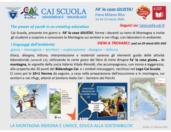 La Struttura Operativa Cai Scuola sarà presente a “FA’ la cosa GIUSTA!” (13-14-15 marzo 2026) nello stand del Cai con un punto informativo, presidiato dai 7 componenti Cai Scuola: Felicia Cutolo Presidente, Angelina Paolantonio, Luisa Lenta, Filippo Di Donato, Monica Boscolo, Manola Terzani e Ciro Nobile.