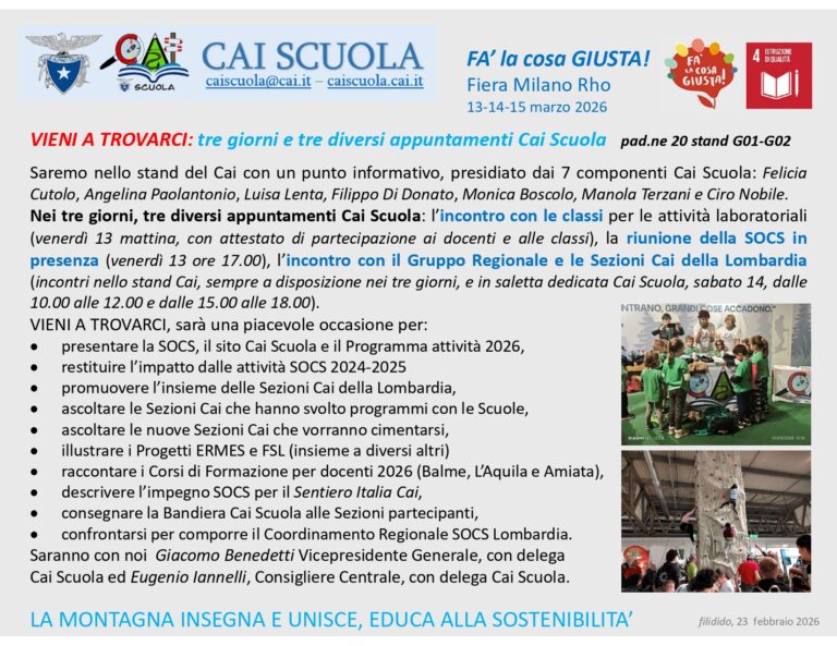 FA’ la cosa GIUSTA! e Cai Scuola Fiera Milano Rho, 13-14 -15 marzo 2026 Vieni a trovarci a Fà la cosa giusta – padiglione 20 stand G01-G02 La Struttura Operativa Cai Scuola sarà presente a “FA’ la cosa GIUSTA!” (13-14-15 marzo 2026) nello stand del Cai con un punto informativo, presidiato dai 7 componenti Cai … Leggi tutto FA’ la cosa GIUSTA! e Cai Scuola – Fiera Milano Rho, 13-14 -15 marzo 2026