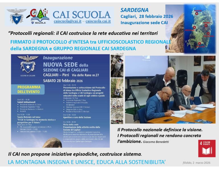 FIRMATO il PROTOCOLLO d’INTESA tra UFFICIO SCOLASTICO REGIONALE della SARDEGNA e GRUPPO REGIONALE CAI SARDEGNA – Cai Scuola Cagliari, sabato 28 febbraio 2026 Il Presidente Generale del CAI Antonio Montani, ha raggiunto Cagliari per partecipare alla giornata CAI, con la firma del protocollo d’intesa tra Ufficio Scolastico Regionale della Sardegna e Gruppo Regionale CAI Sardegna. … Leggi tutto FIRMATO il PROTOCOLLO d’INTESA tra UFFICIO SCOLASTICO REGIONALE della SARDEGNA e GRUPPO REGIONALE CAI SARDEGNA – Cai Scuola