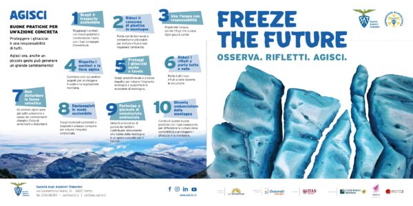 “I ghiacciai – sottolinea Cristian Ferrari, presidente di SAT – non sono solo spettacolari paesaggi montani, ma vere e proprie sentinelle del clima, la cui rapida fusione ha conseguenze dirette sugli ecosistemi, sulle risorse idriche e sulla stabilità ambientale”. SAT ha voluto strutturare un percorso di consapevolezza e azioni concrete sottolineando l’urgenza di proteggere questi custodi ambientali. “In un momento storico in cui la crisi climatica è sempre più evidente “Freeze the Future” vuole essere un appello all’azione, un invito rivolto a tutti per preservare un patrimonio naturale di inestimabile valore”