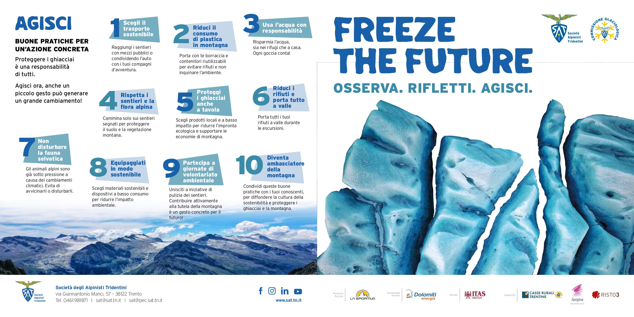 Società Alpinisti Tridentini C’è un messaggio molto efficace della SAT – Società Alpinisti Tridentini, che vogliamo fare nostro: OSSERVA – RIFLETTI – AGISCI Coniato per il progetto di sensibilizzazione: “FREEZE THE FUTURE”, mirato per questo 2025 Anno Internazionale della Conservazione dei Ghiacciai.