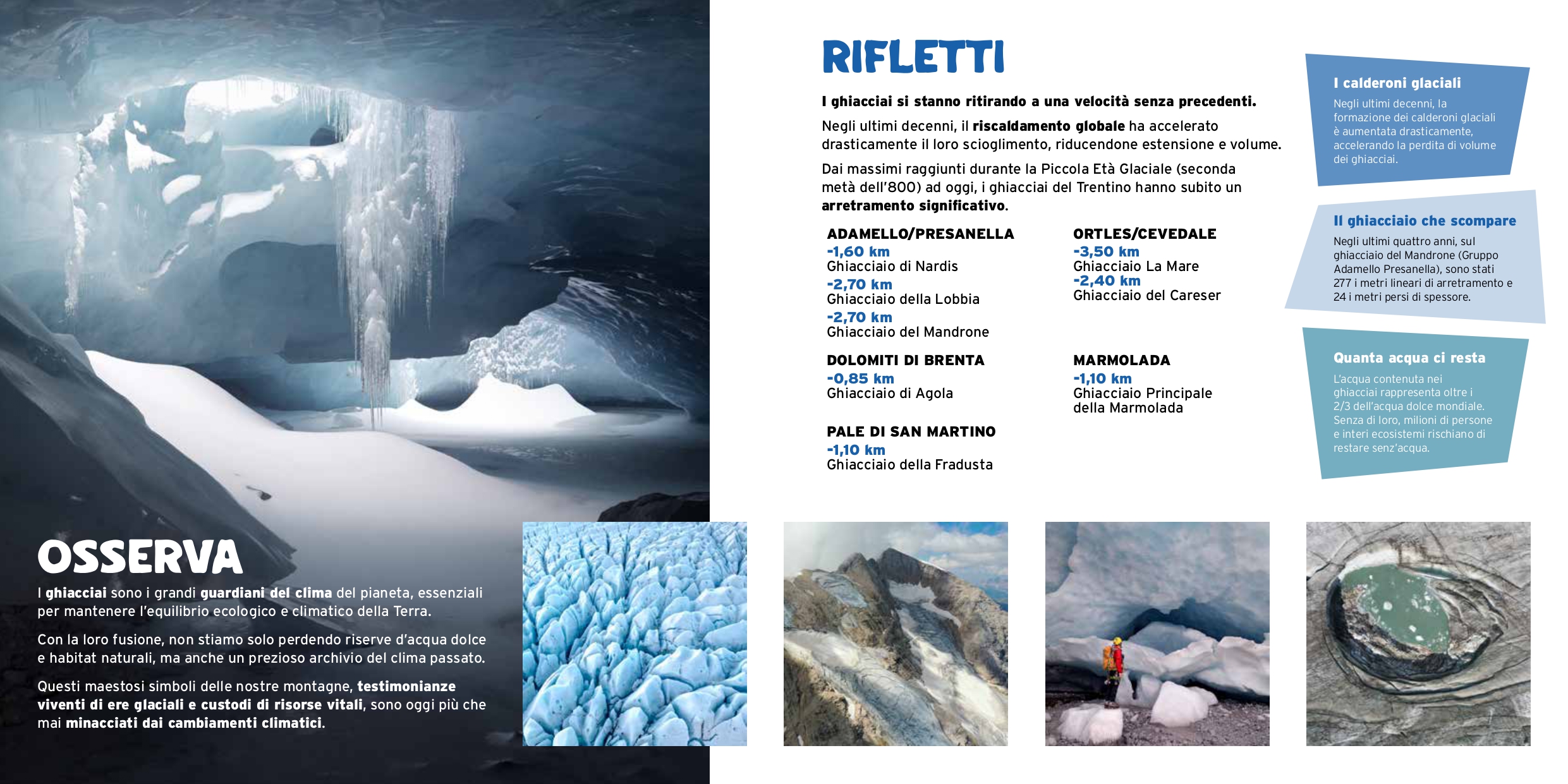 Tema importante per tutti Nelle regioni del nord il tema è stato fortemente dibattuto lungo tutto l’arco alpino, dal Forte di Bard alle sedi SAT. Tutti, in ogni parte d’Italia possono trarre spunti da: Ghiacciai, Permafrost, Neve e Acqua. Argomenti densi di stimoli per organizzare attività con le scuole, con l’obiettivo di sensibilizzare e coinvolgere studenti e insegnanti sui temi legati alla trasformazione dell’ambiente montano e al valore della molecola H2O, presente nei diversi stati di aggregazione: solido (ghiaccio, neve, grandine), liquido (acqua nei fiumi, laghi e mari) e gassoso (vapore acqueo nell’aria e nelle nuvole) Dell’accelerata fusione dei ghiacciai abbiamo detto, causata dall’innalzamento delle temperature e dall’inquinamento; la loro riduzione, rappresenta una delle sfide ambientali più urgenti del nostro tempo, con modifiche del paesaggio, impatti profondi sull’ecosistema, sulla biodiversità e sulle economie locali.