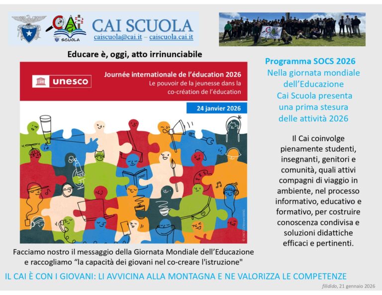 Giornata Mondiale Educazione, sabato 24 gennaio 2026 – Cai Scuola Giornata Mondiale Educazione, sabato 24 gennaio 2026 – Cai Scuola “The power of youth in co-creating education” Nella giornata dell’Educazione Cai Scuola presenta una prima stesura del Programma Attività 2026 Educare è, oggi, atto irrinunciabile Facciamo nostro il messaggio della Giornata Mondiale dell’Educazione e raccogliamo … Leggi tutto Giornata Mondiale Educazione, sabato 24 gennaio 2026 – Cai Scuola