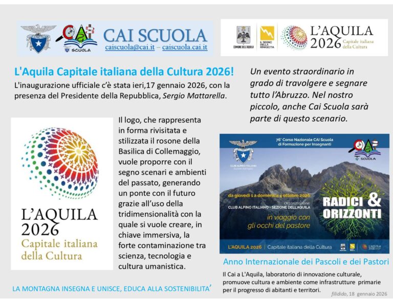 L’Aquila Capitale italiana della Cultura 2026! – Cai Scuola L’Aquila Capitale italiana della Cultura 2026! – Cai Scuola L’inaugurazione ufficiale il 17 gennaio 2026, con la presenza del Presidente della Repubblica Sergio Mattarella. Un evento straordinario in grado di travolgere e segnare tutto l’Abruzzo. Nel nostro piccolo, anche Cai Scuola sarà parte di questo scenario. … Leggi tutto L’Aquila Capitale italiana della Cultura 2026! – Cai Scuola