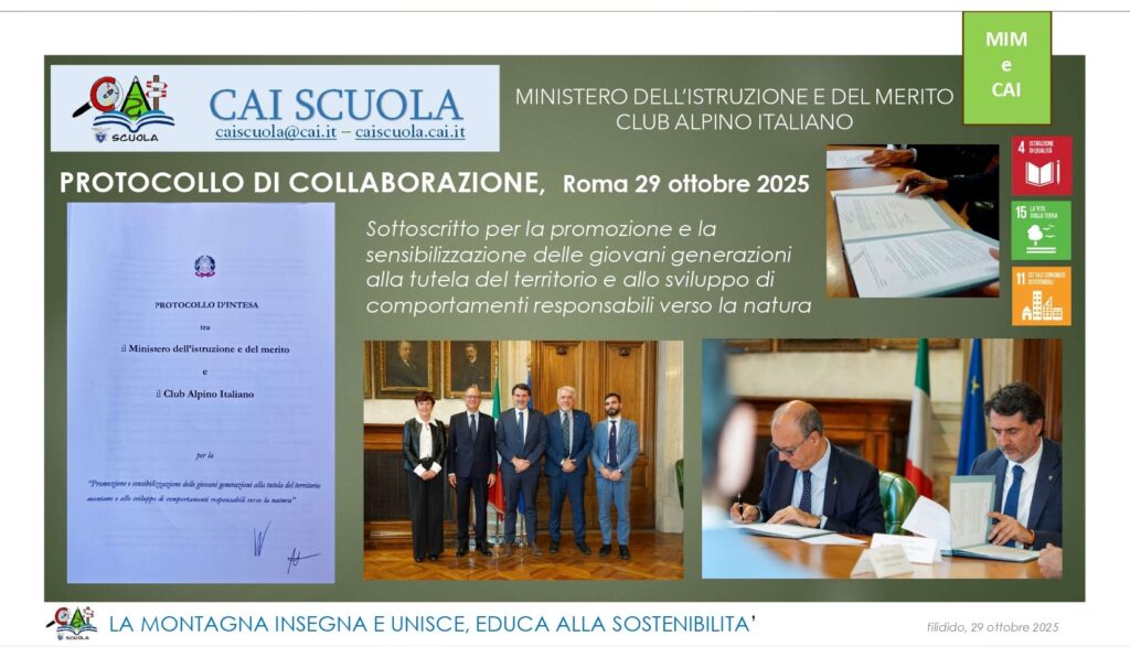 PROTOCOLLO D’INTESA TRA IL MINISTERO DELL’ISTRUZIONE E DEL MERITO E IL CLUB ALPINO ITALIANO – Roma, mercoledì 29 ottobre 2025 – Cai Scuola MIM e CAI A Roma, 29 ottobre 2025, il Club Alpino Italiano ed il Ministero dell’Istruzione e del Merito hanno sottoscritto un importante Protocollo d’intesa finalizzato a promuovere e sensibilizzare le giovani … Leggi tutto PROTOCOLLO D’INTESA TRA IL MINISTERO DELL’ISTRUZIONE E DEL MERITO E IL CLUB ALPINO ITALIANO – Roma, mercoledì 29 ottobre 2025 – Cai Scuola