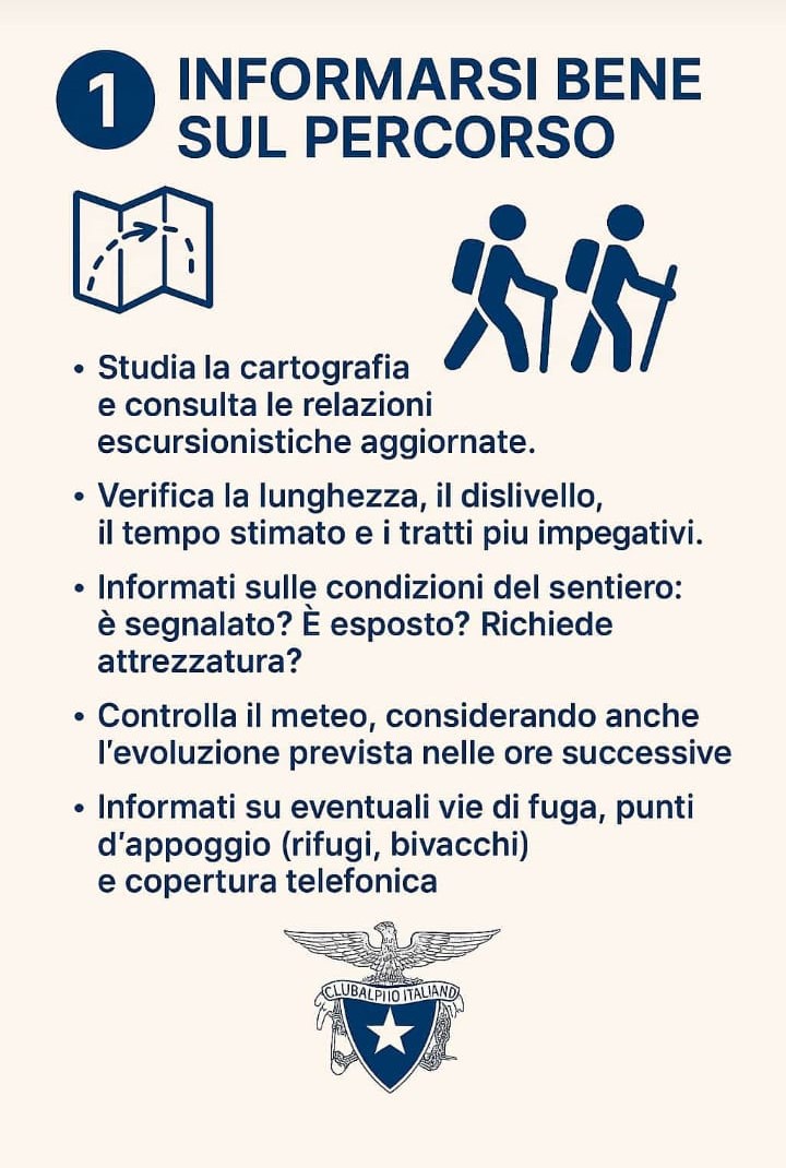 Indispensabile conoscere le caratteristiche del sentiero scelto: lunghezza, dislivello e difficoltà tecniche, valutando anche le vie di fuga. Le Sezioni Cai e i Rifugisti forniscono informazioni utili sulle condizioni ambientali dei percorsi. Comunichiamo sempre a qualcuno di fiducia il programma della giornata e l’escursione scelta.