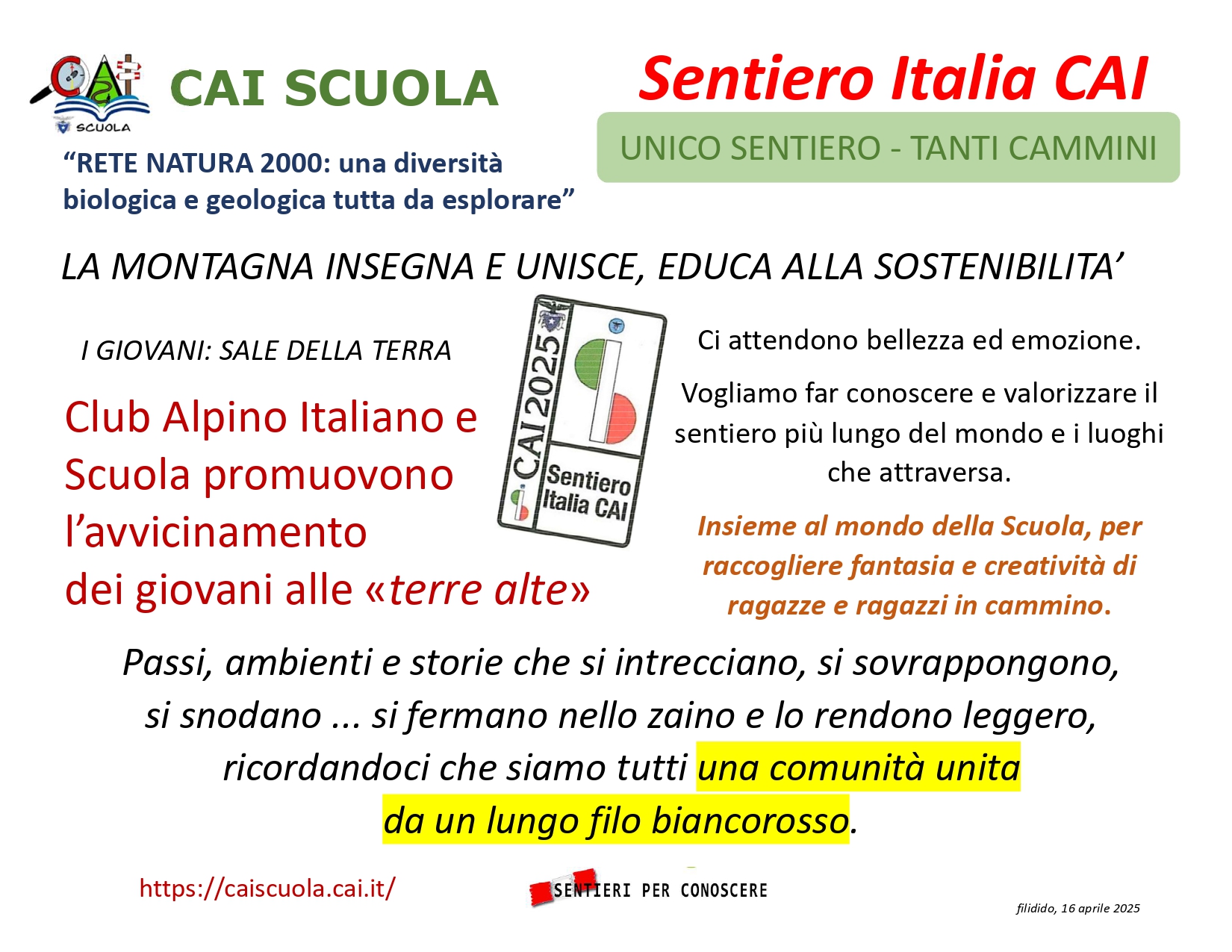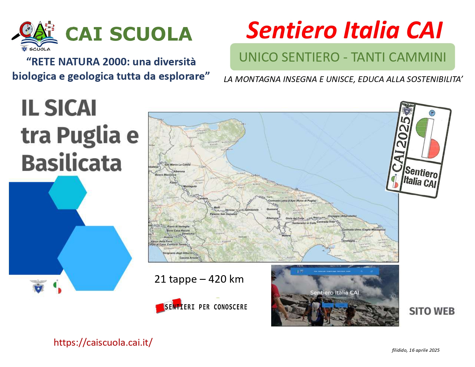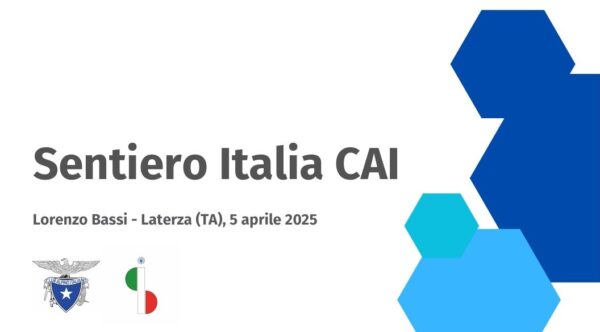Riportiamo alla fine la Presentazione di Lorenzo Bassi SOSEC, sul Sentiero Italia Cai, illustrata lo scorso venerdì 4 aprile 2025 a Laterza (TA), per definire gli aspetti conclusivi del tracciato SICAI in Puglia e il collegamento con Matera (Basilicata)