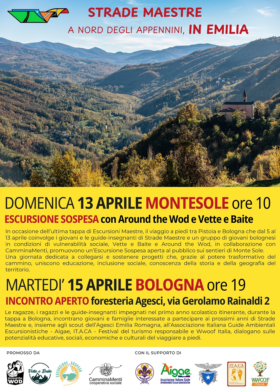 In Cammino tra Toscana ed Emilia RomagnaIl gruppo di Strade Maestre procede verso il nord Italia, dopo aver superato gli Appennini, si ferma per questa settimana a Bologna. Negli ultimi giorni i giovani e le guide-insegnanti hanno seguito un percorso a piedi tra Pistoia e Bologna, tra il 5 e il 13 aprile, insieme a un gruppo di giovani in condizioni di vulnerabilità sociale che li ha portati, tra l’altro, a pernottare nel Rifugio Cai del Montanaro, domenica 6 aprile. Un’esperienza speciale compiuta da Strade Maestre nell’ambito del progetto Escursioni Maestre, organizzata da Vette e Baite e Around the Wod, che si è conclusa domenica 13 con una grande Escursione Sospesa aperta al pubblico sui sentieri di Monte Sole. Una giornata speciale che – come racconta Marco Saverio Loperfido – ha permesso di far conoscere progetti che, grazie al potere trasformativo del cammino, uniscono educazione, inclusione sociale, comprensione della storia e della geografia del territorio.