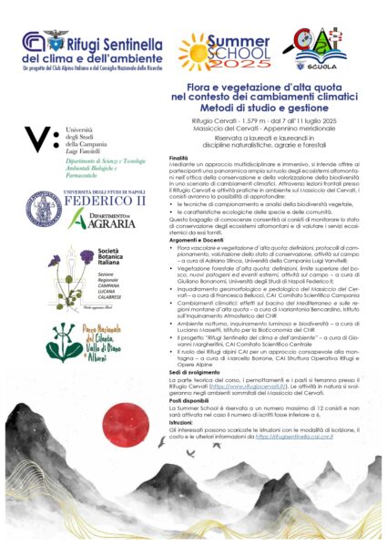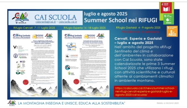 Nell’ambito del progetto “Rifugi Sentinella del clima e dell’ambiente in collaborazione con Cai Scuola, sono state calendarizzate le prime 3 Summer School 2025 che utilizzano i rifugi, con attività scientifiche e culturali attente ai cambiamenti climatici in ambiente montano.