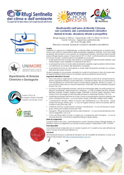 A seguire nel Rifugio Esperia a 1500 m (Cai Modena) ai piedi del monte Cimone, nel Parco del Frignano e Osservatorio CNR “O. Vittori”: Biodiversità nell’area di Monte Cimone nel contesto dei cambiamenti climatici – Metodi di studio, situazione attuale e prospettive.
