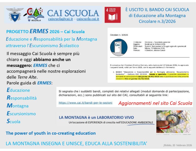 Educazione e Responsabilità per la Montagna attraverso l’Escursionismo Scolastico – ERMES 2026, Cai Scuola Il Club Alpino Italiano ha costituito un fondo di 90.000 euro per sostenere i progetti ERMES 2026 – Educazione e Responsabilità per la Montagna attraverso l’Escursionismo Scolastico, realizzati dalle Sezioni nel corrente anno 2026 in collaborazione con Istituti Scolatici di ogni … Leggi tutto Educazione e Responsabilità per la Montagna attraverso l’Escursionismo Scolastico – ERMES 2026, Cai Scuola