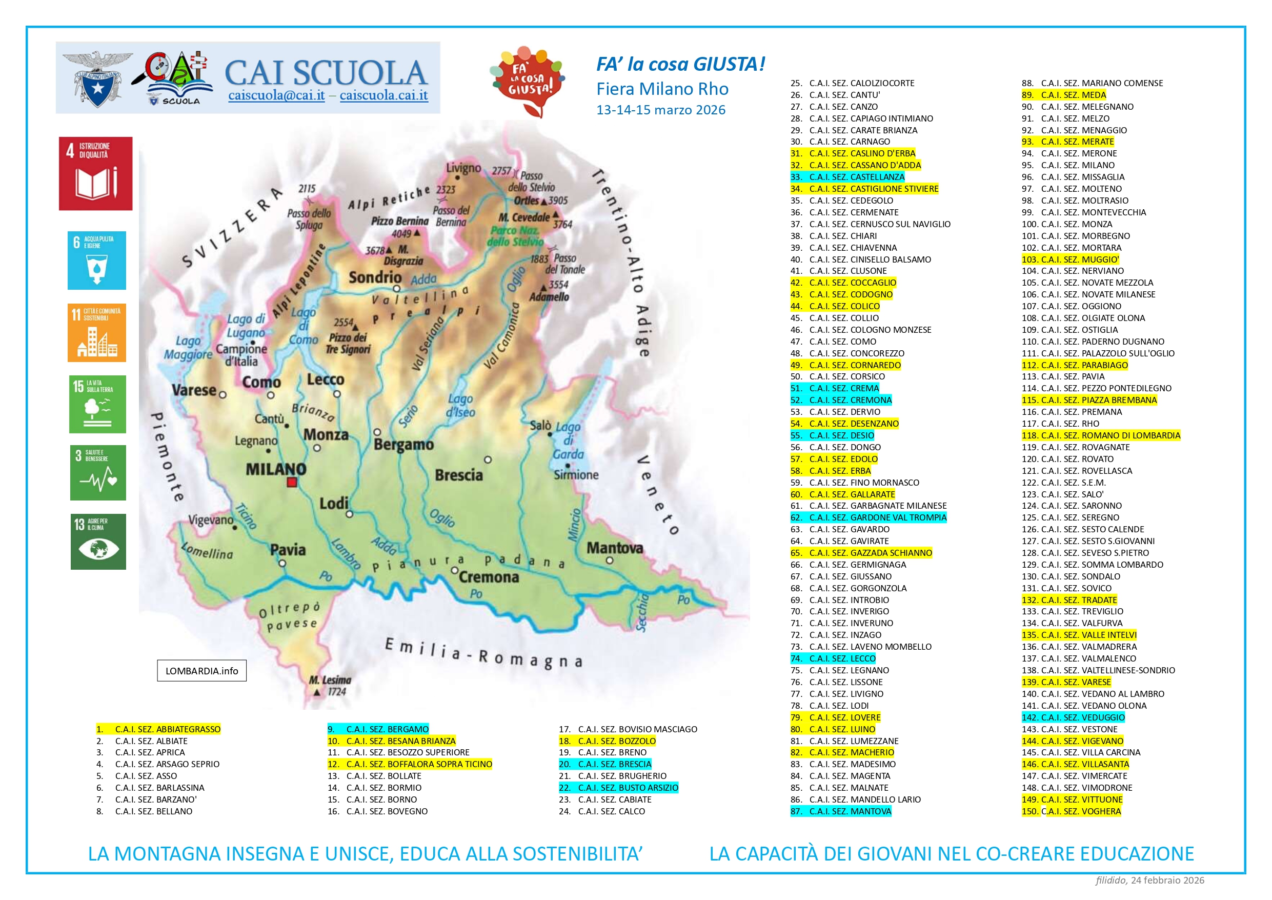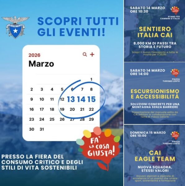 La Struttura Operativa Cai Scuola sarà presente a “FA’ la cosa GIUSTA!” (13-14-15 marzo 2026) nello stand del Cai con un punto informativo, presidiato dai 7 componenti Cai Scuola: Felicia Cutolo Presidente, Angelina Paolantonio, Luisa Lenta, Filippo Di Donato, Monica Boscolo, Manola Terzani e Ciro Nobile.