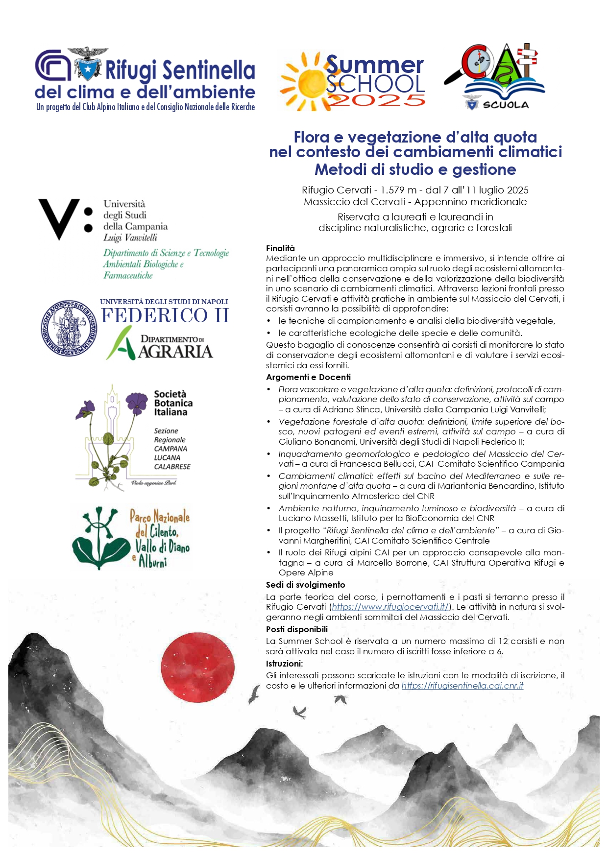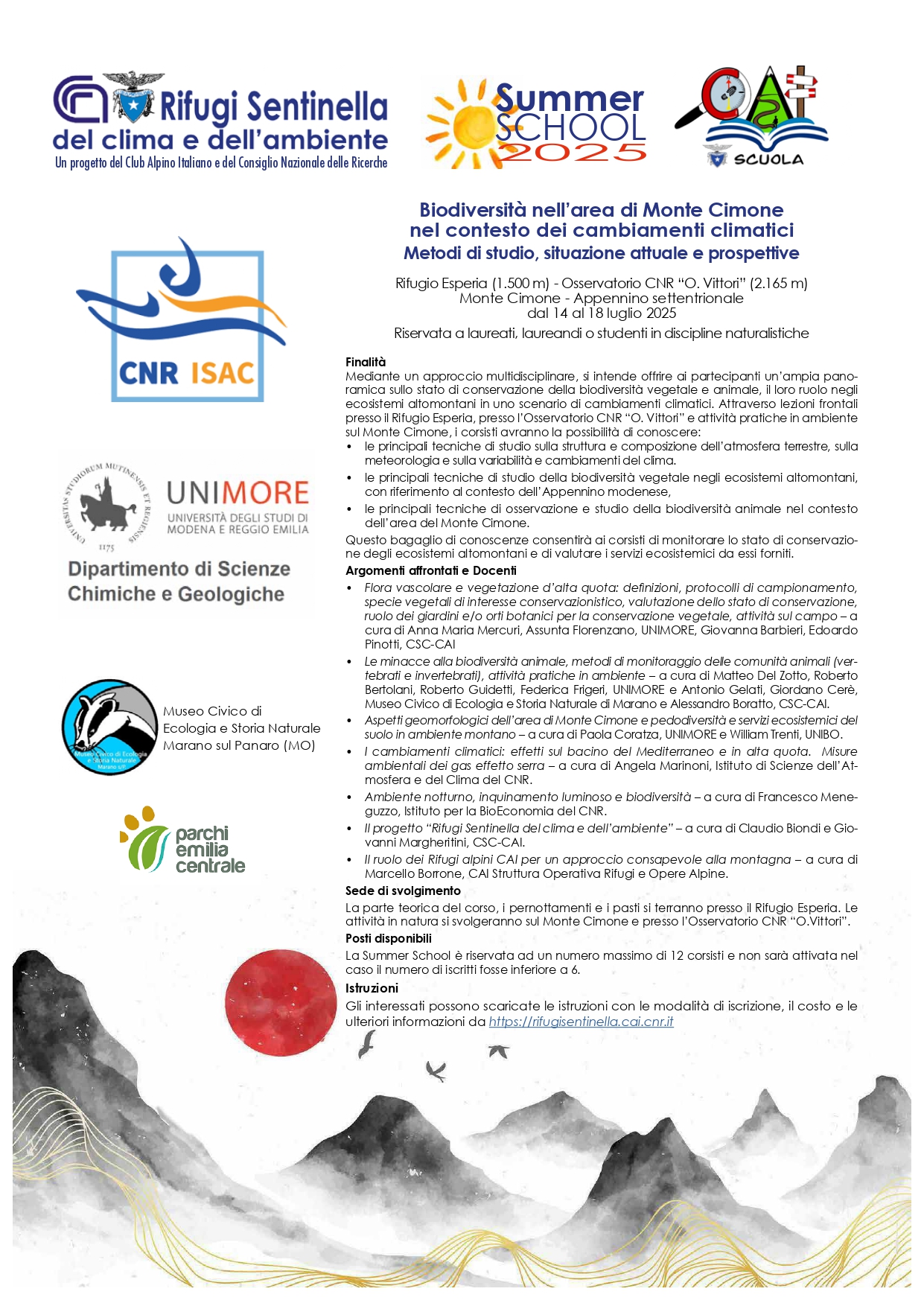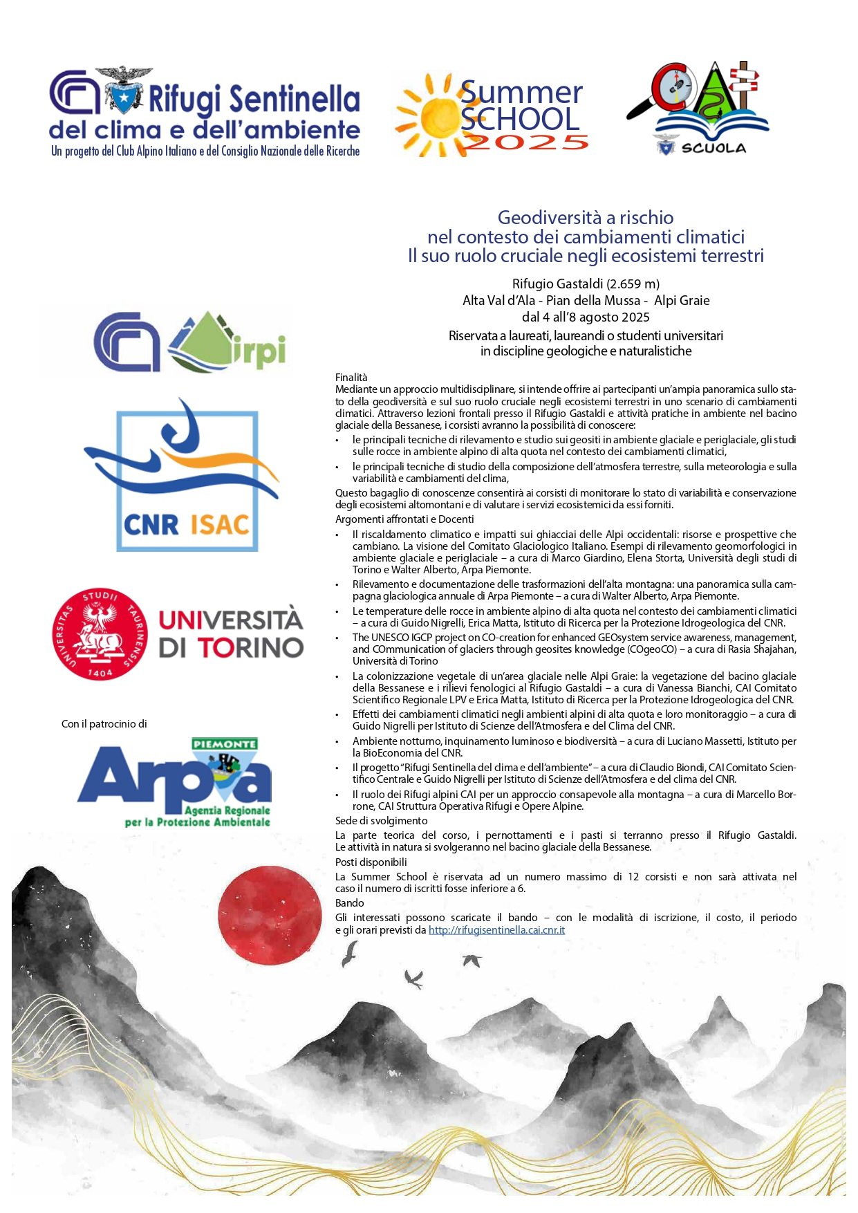 Nell’ambito del progetto “Rifugi Sentinella del clima e dell’ambiente in collaborazione con Cai Scuola, sono state calendarizzate le prime 3 Summer School 2025 che utilizzano i rifugi, con attività scientifiche attente ai cambiamenti climatici in ambiente montano.