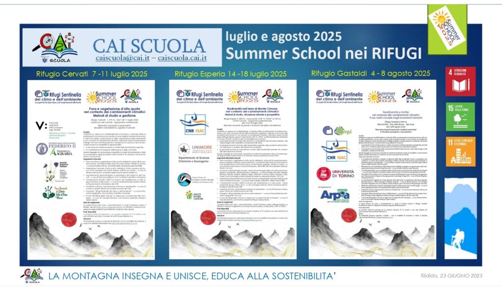 Summer School nei Rifugi: Cervati, Esperia e Gastaldi – luglio e agosto 2025 – Cai Scuola L’iniziativa, l’obiettivo Nell’ambito del progetto “Rifugi Sentinella del clima e dell’ambiente in collaborazione con Cai Scuola, sono state calendarizzate le prime 3 Summer School 2025 che utilizzano i rifugi, con attività scientifiche attente ai cambiamenti climatici in ambiente montano. … Leggi tutto Summer School nei Rifugi: Cervati, Esperia e Gastaldi – luglio e agosto 2025 – Cai Scuola