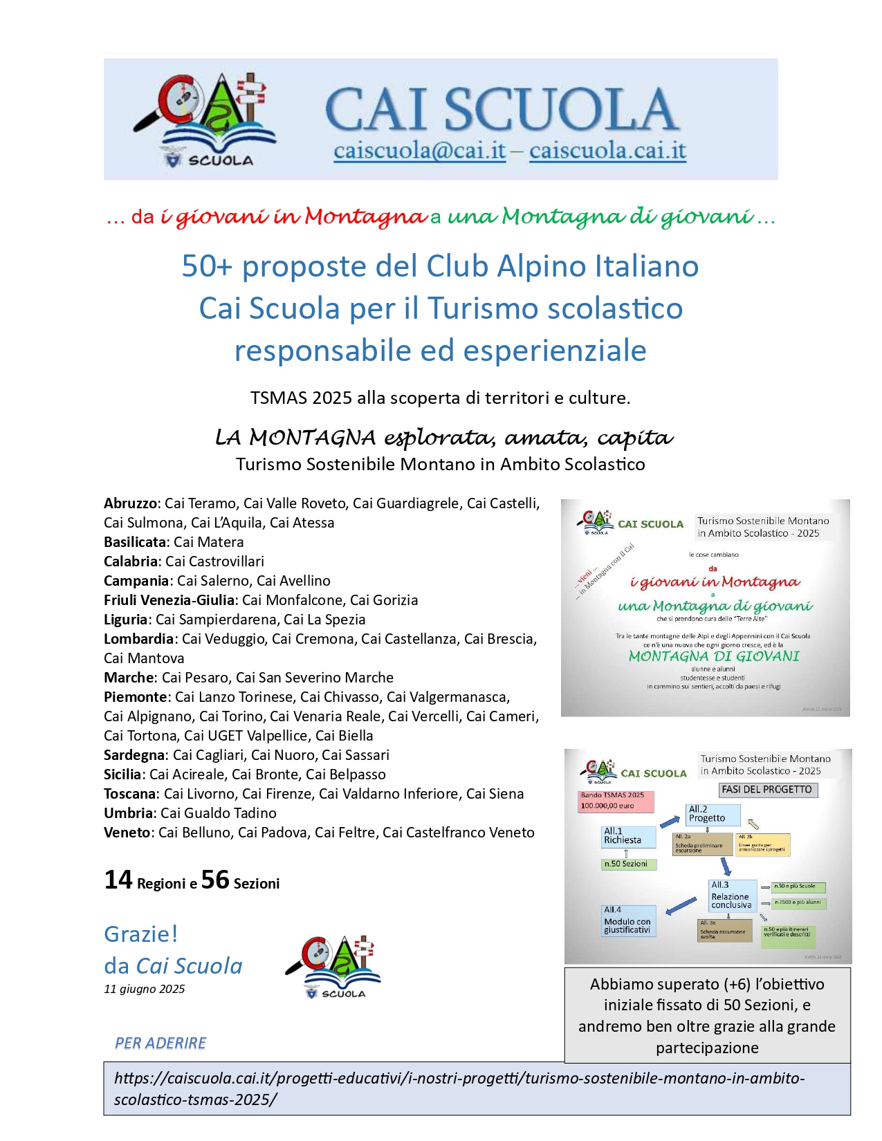 Il Club alpino italiano ha costituito un fondo di 100.000 euro per sostenere progetti di Turismo Sostenibile Montano in Ambito Scolastico realizzati dalle Sezioni nel corrente anno (2025) in collaborazione con Istituti Scolatici di ogni ordine e grado e con sedi universitarie.