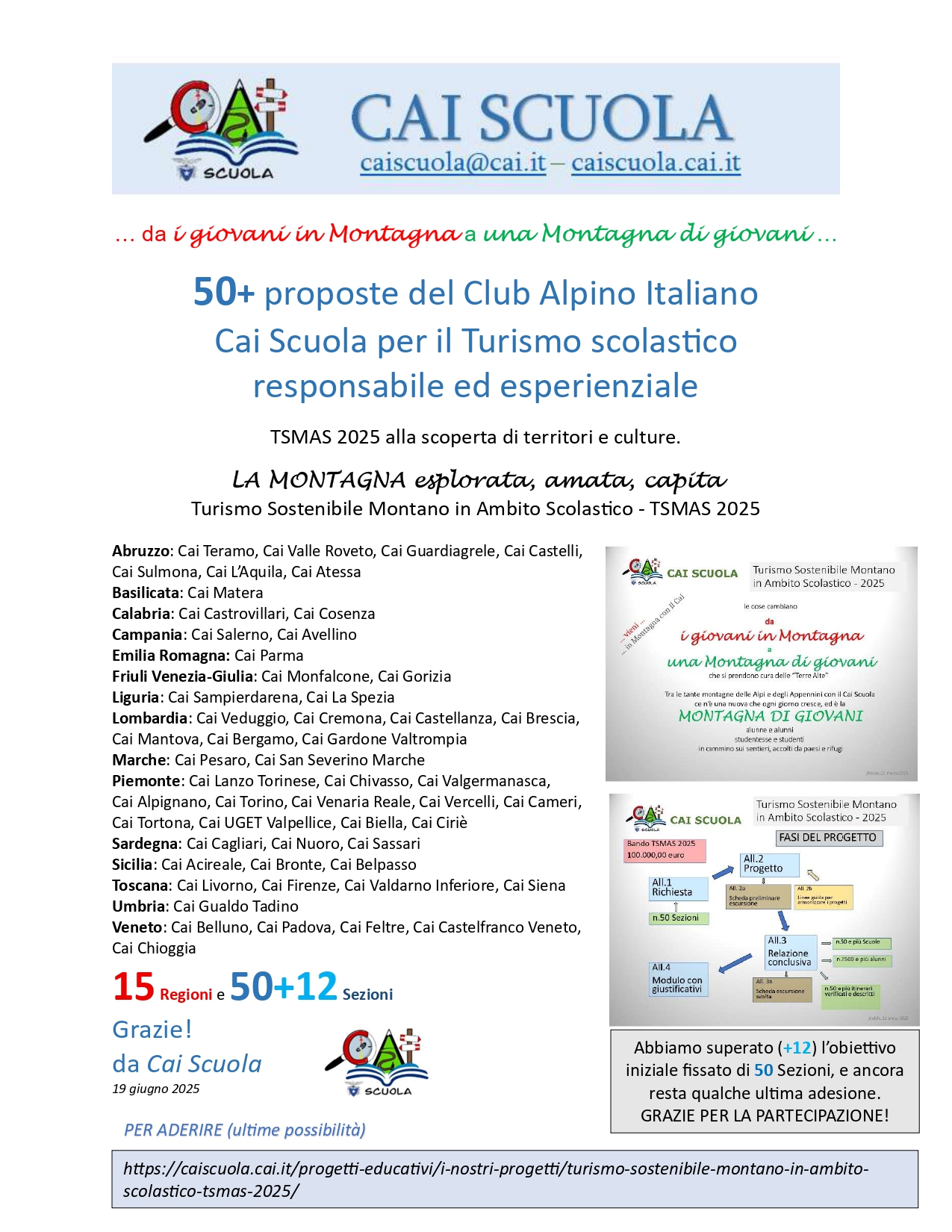 Al 19 giugno 2025 avevano aderito n. 50+12 Sezioni Cai da 15 Regioni